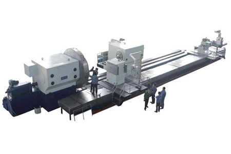 對于分離床身結(jié)構(gòu),機床主要由刀架床身、工件床身、主軸箱、尾座上體、尾座下體、床鞍刀架、自動鐵屑輸送裝置、閉式中心架、開式中心架,移動走臺、數(shù)控系統(tǒng)、靜壓系統(tǒng)( 根據(jù)機床噸位選配)、電氣控制裝置等部件組成。尾座、閉式中心架和開式中心架可在工件床身上移動,刀架在刀架床身上移動。工件床身與刀架床身之間設有鐵屑輸送裝置,刀架和尾座設有托鏈裝置。
