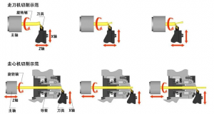 數(shù)控走心機與數(shù)控走刀機都屬于數(shù)控臥式車床。傳統(tǒng)的數(shù)控車床以走刀模式為主,稱為走刀車床。產(chǎn)品單次夾持位始終保持不變,不能進行多次送料,只能通過主軸C軸的旋轉(zhuǎn)及刀架Z/X/Y移動對產(chǎn)品進行加工。針對長軸類產(chǎn)品只能采用頂針頂著端面以及額外安裝跟刀支架,但最終很難做到理想精度以及一次性完成產(chǎn)品工藝要求。