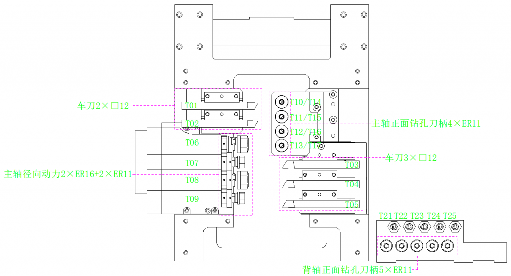 | 主軸徑向動力刀具數(shù)量(正面) | ER | 2×ER11+2×ER16(T07/T09+T06/T08) | |